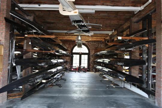 The large floor-to-ceiling windows let in lots of light and the brick walls keep rowers cool as they erg. The balcony offers a great view of the river (and HBS…). Old black-and-white photos line the walls as reminders of former athletes. The cavernous rooms can have a humbling effect.