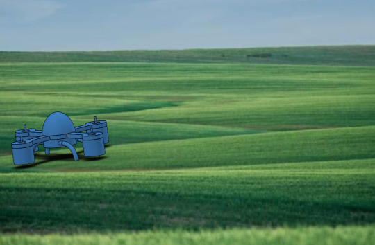 3D-rendered concept drone flying over green rolling hills, likely a student design project.