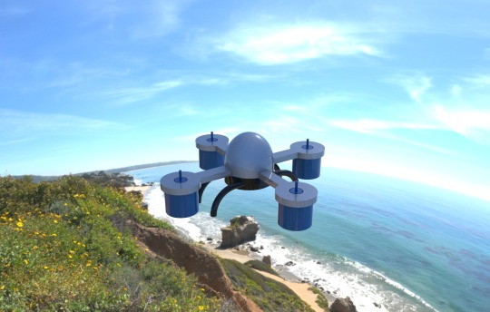 3D-rendered concept drone flying over a scenic coastal cliff with ocean and wildflowers, likely a student design project.