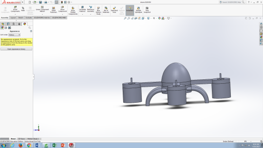 3D CAD model of a quadcopter drone designed in SolidWorks, shown in the SolidWorks interface.