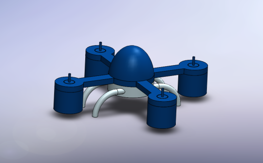 3D CAD model of a quadcopter drone rendered in dark blue, created as a class assignment in SolidWorks or similar software.