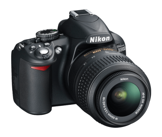 Nikon D3100 DSLR camera, an entry-level SLR that the poster has used since high school to build a professional photography portfolio.