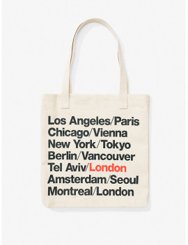 An American Apparel canvas tote bag printed with world city names in the brand's signature Helvetica-style sans-serif font.