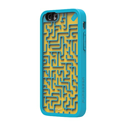PureGear Amazing Case for iPhone, a phone case with a built-in sliding ball maze puzzle in contrasting teal and yellow.
