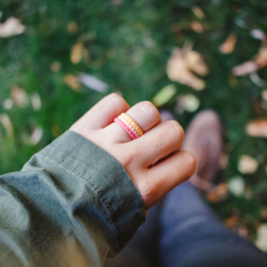 Enso Rings, colorful silicone wedding bands designed as safer, more affordable, and comfortable alternatives to traditional metal rings.