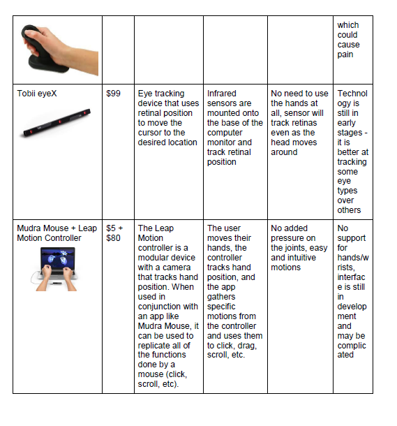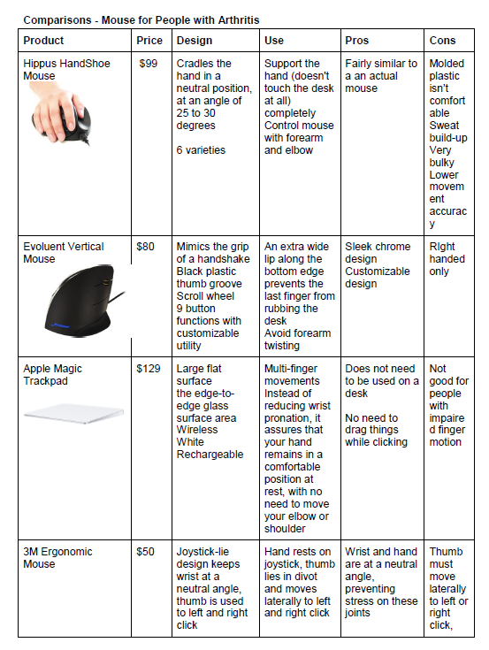 Final ChallengeA comparison chart of ergonomic mouse designs for people with arthritis, including the Hippus HandShoe Mouse, Evoluent Vertical Mouse, Apple Magic Trackpad, and 3M Ergonomic Mouse, plus eye and hand tracking alternatives.