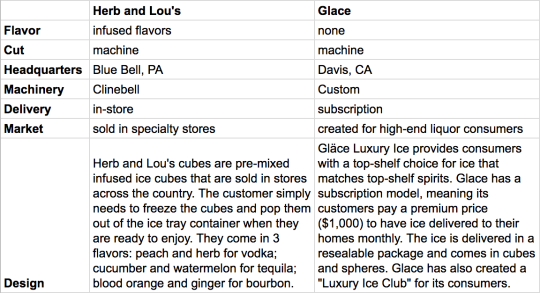 Market research analysis of artisan ice companies (Herb and Lou's, Glace, regional distributors) identifying a niche for non-flavored high-end ice in specialty stores.