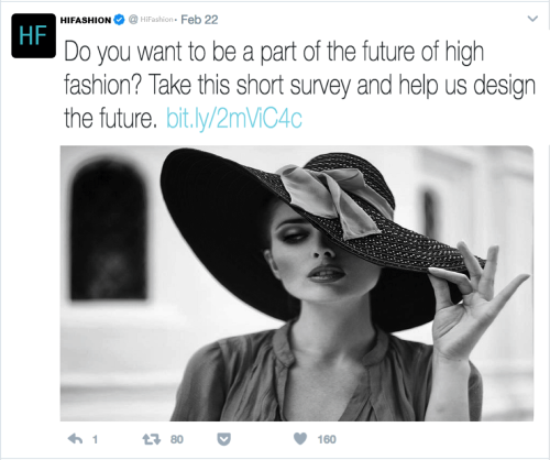 The appeal of the design is to excite women about being part of the process of a major fashion company, therefore our question asks: “Do you want to be a part of the future of HiFashion?” The ability of people is already very high (it’s a pretty simple survey), but motivation is low, that is where the thought that you could contribute to the design of something millions of people will wear is exciting. We believe the goal of 500 users engaging with the posts is very doable, and using Instagram will give us a relatively representative sample, though we have included a Twitter post as well because the nature of Instagram is such that you cannot actually post a clickable link in the feed itself.