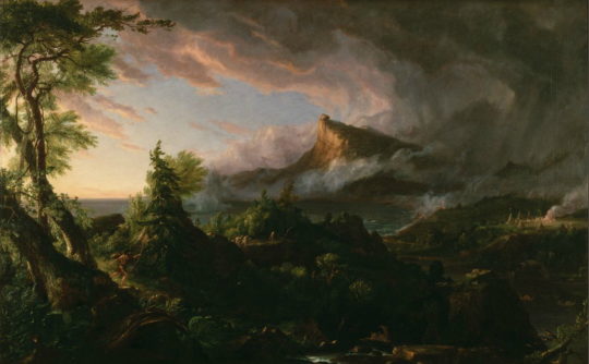 Course of Empire is a series of paintings by Thomas Cole that all show the same set of land. Each of the five paintings shows a different piece of the empire, and I have never seen anything like it. It begins with “The Savage State” and progresses all the way through the ruins of a destroyed city in “Desolation.” I thought showing action through paintings like this was a really innovative way to tell a story in this medium, and they remain some of my favorite pieces of art ever.