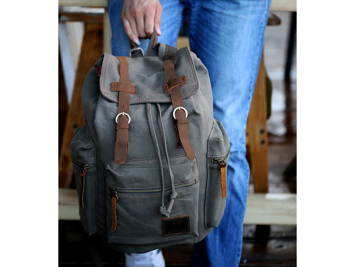 Canvas backpack with leather trimmings in the style of Herschel, blending rugged outdoor heritage with modern student fashion.