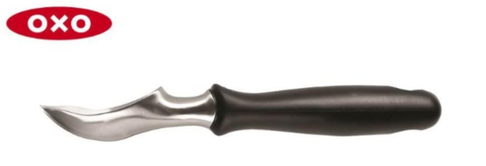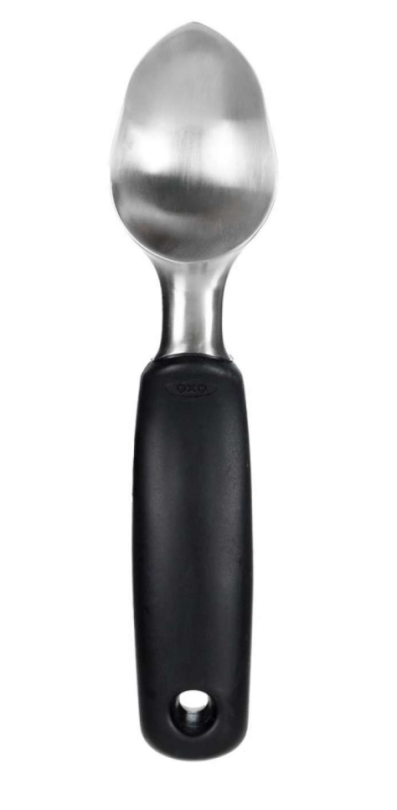 OXO stainless steel ice cream scoop with pointed front tip and flat-edged bowl for scooping frozen ice cream and reaching container corners.