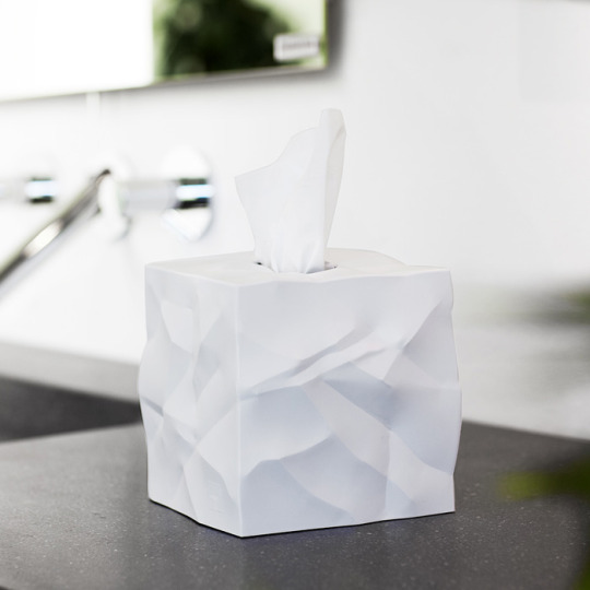 The Wipy Cube tissue box cover, a white sculptural cover with crumpled geometric facets that transforms a utilitarian tissue box into a design object.