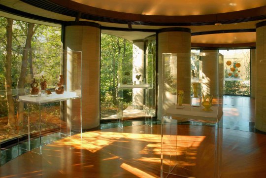 This building has 8 interconnected dome-shaped galleries, with curved glass walls. Dumbarton Oaks has beautiful gardens and Johnson said that he wanted the gardens to “march right up to the museum displays and become part of them.” The muted colours of the building materials and the mostly transparent display cases make the greenery pop.