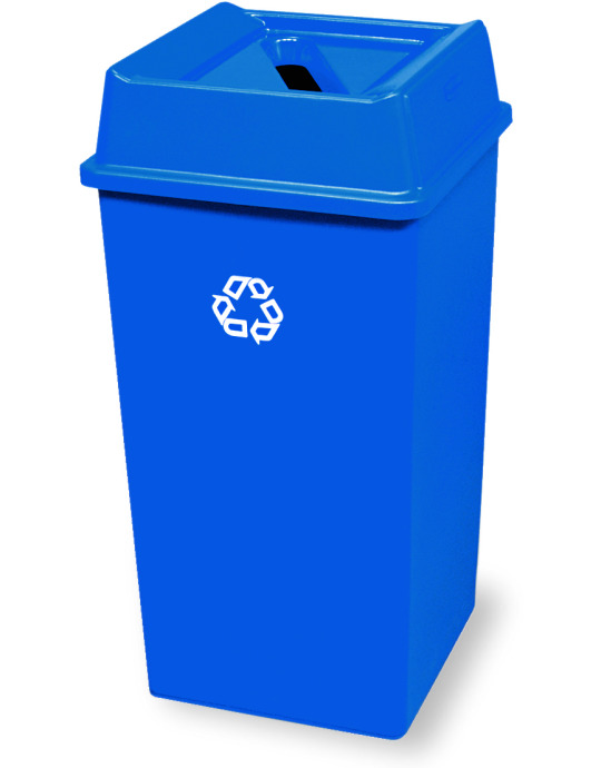 A standard blue recycling bin with the universal recycling symbol and a restrictive cap designed to nudge correct sorting behavior.