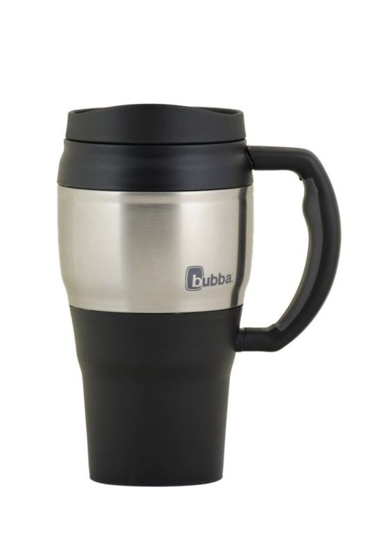 Bubba brand insulated travel mug with ergonomic handle, rubber grip, and dual hot/cold temperature retention, purchased at CVS.