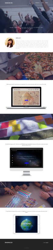 This weekend, I had to develop my online portfolio for an event I was applying to, which aligned serendipitously with this weeks’ graphic design challenge. I used Squarespace to design my portfolio, but first laid out my vision for the website via Sketch. In the process, I edited a series of original images using Photoshop (I adjusted the brightness, hue, saturation; lowered the opacity; and placed the images on top of background layers of different colors to complement the photographs). You can view the mockup of my portfolio below, (though for some reason it becomes really blurry when I upload it to Tumblr, so feel free to view my actual website at www.shashaxdu.com – still in progress).