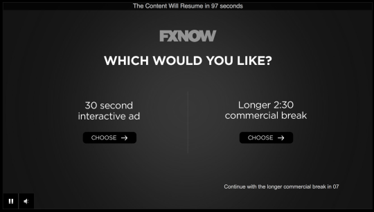Interactive ad format on streaming sites (FXNOW/Hulu) powered by true[X], offering viewers a 30-second interactive ad instead of a traditional 2:30 commercial break.