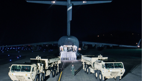 THAAD (Terminal High Altitude Area Defense) missile defense system, a transportable military technology for intercepting ballistic missiles.