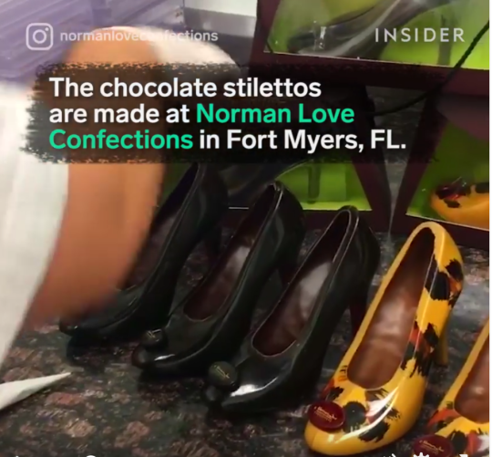 Chocolate stiletto shoes by Norman Love Confections — high-heeled shoes made entirely of chocolate with edible painted exteriors.