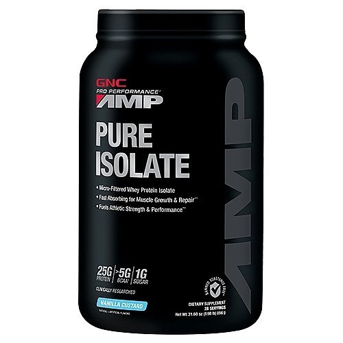 GNC Pro Performance AMP Pure Isolate whey protein powder, used for muscle building and meeting protein macros as a vegetarian.