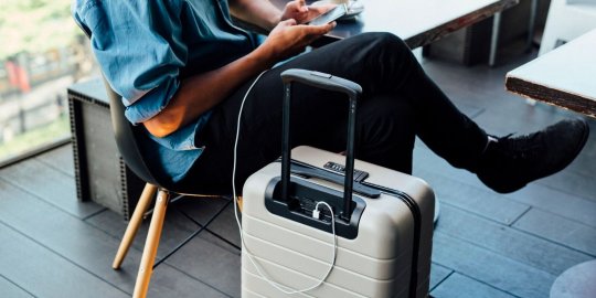 Away carry-on luggage with built-in USB battery charger, designed with airline size compliance in mind.
