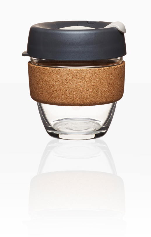 KeepCup, a glass-walled travel coffee mug with cork insulation and plastic lid, designed for leak-proof on-the-go coffee consumption.