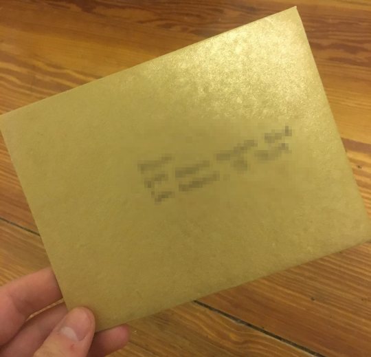 Shiny gold stationery envelopes chosen as a Mother's Day card for a mother who owned a stationery store.