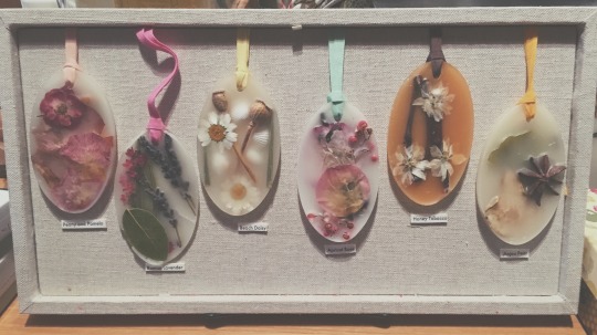 Artisan soaps with embedded dried flowers and scented botanical pieces, hung on decorative ribbons.