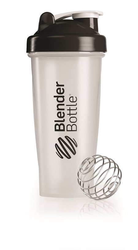 Blender Bottle shaker cup with a wire whisk ball for mixing protein shakes on the go.