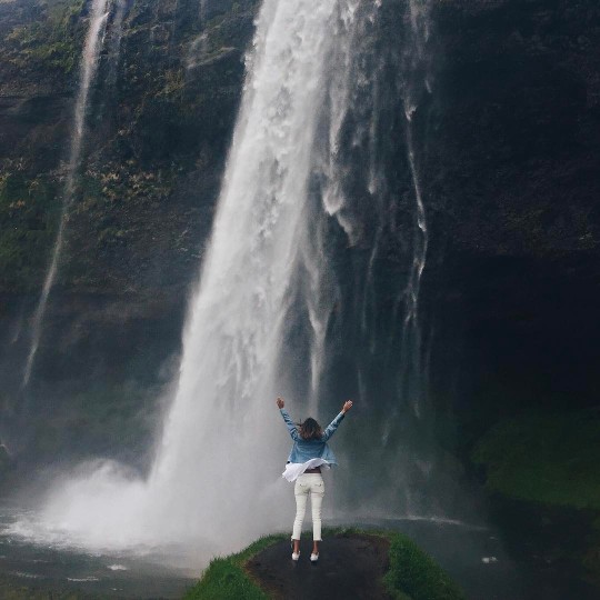 An Instagram photo by fashion blogger Aimee Song showing a woman with arms raised before a massive waterfall, discussed as an example of Instagram's power as a platform for aspirational lifestyle photography.