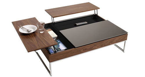 This version of the coffee table offers clever storage solutions in an effort to maximize space and minimize clutter. In addition, it features movable tabletops that can be adjusted to different heights based on someone’s needs, whether that is eating (as shown in the image above) or working on a laptop. The table also allows for choice in personalization with regard to the different colors and types of wood used for the three panels that make up the table’s surface.