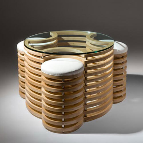 This version of the coffee table has a 3D appearance and could serve as a work of art. It offers more than one function, as it also provides seating through the three stools that fit into the side of the table, tucked underneath the glass surface. There’s potential for it to serve as a space saver, allowing the owner flexibility in deciding whether or not to purchase a separate seating unit. I think this is a fantastic example of innovative design where normal, everyday products or objects can be repurposed to have several functions.