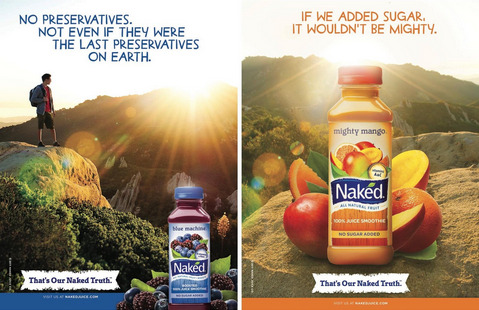 Naked Juice: bottled smoothie brand with rich colors, thick bottle material, and healthy/organic marketing image.
