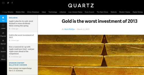 Quartz, a digital news site with sleek design and evolving topic categories covering global issues.