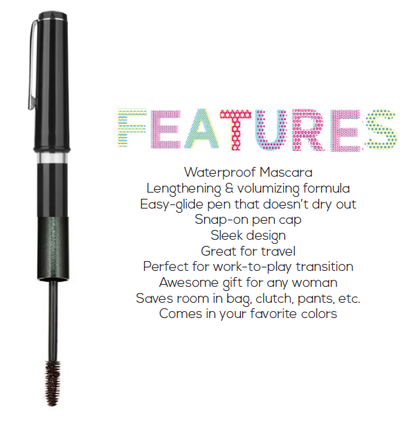 Who says women can’t have it all? Forgot your pen? No, it’s in your make-up bag. Forgot your mascara? No, look in your briefcase. “Pretty in Pen” is a dual tip wonder: on side, you have a high quality ink pen for all of your writing needs, on the other side a mascara wand designed to lengthen and volumize your lashes when you need that wow factor.