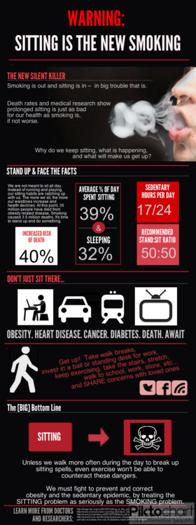 An infographic comparing prolonged sitting to smoking, with statistics and improvement tips.