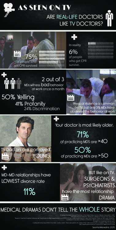 An infographic contrasting TV medical drama outcomes with actual medical statistics.
