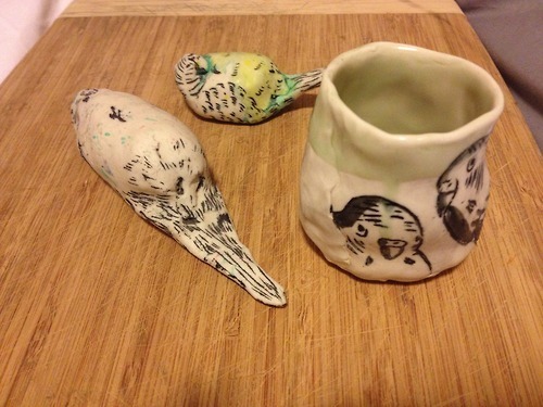 Handmade porcelain canary figurines and illustrated teacup by ceramist Rumi Koshino, acquired through a silent auction and direct from the artist.
