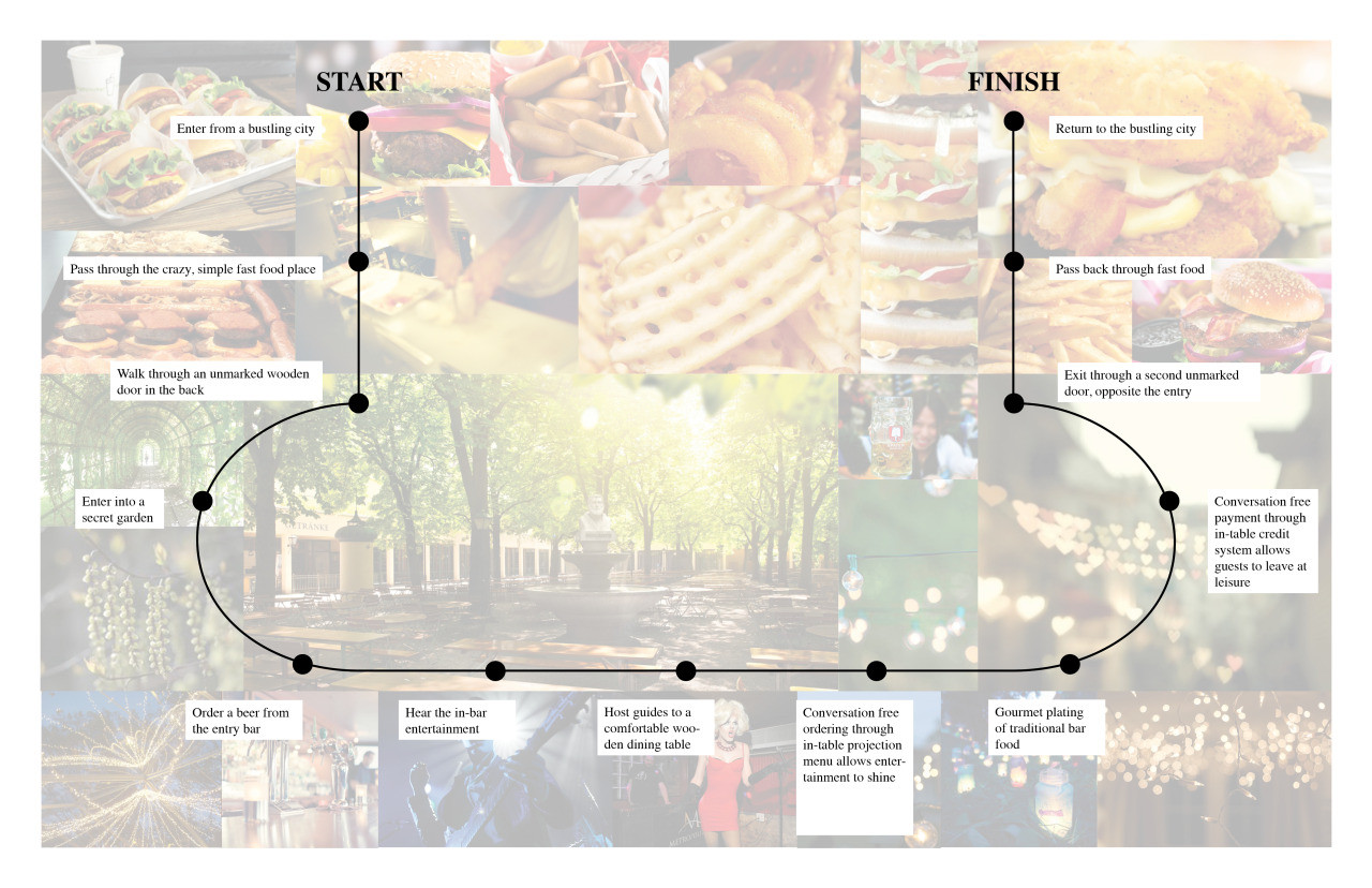 Imagine a restaurant experience of discovery and contrasts. We propose a fast-paced fast food restaurant in an urban environment that provides an unmarked entrance to a secret leisurely garden. The standardness and familiarity of fast food heightens the portal to another world, allowing everyone to make the space their own.