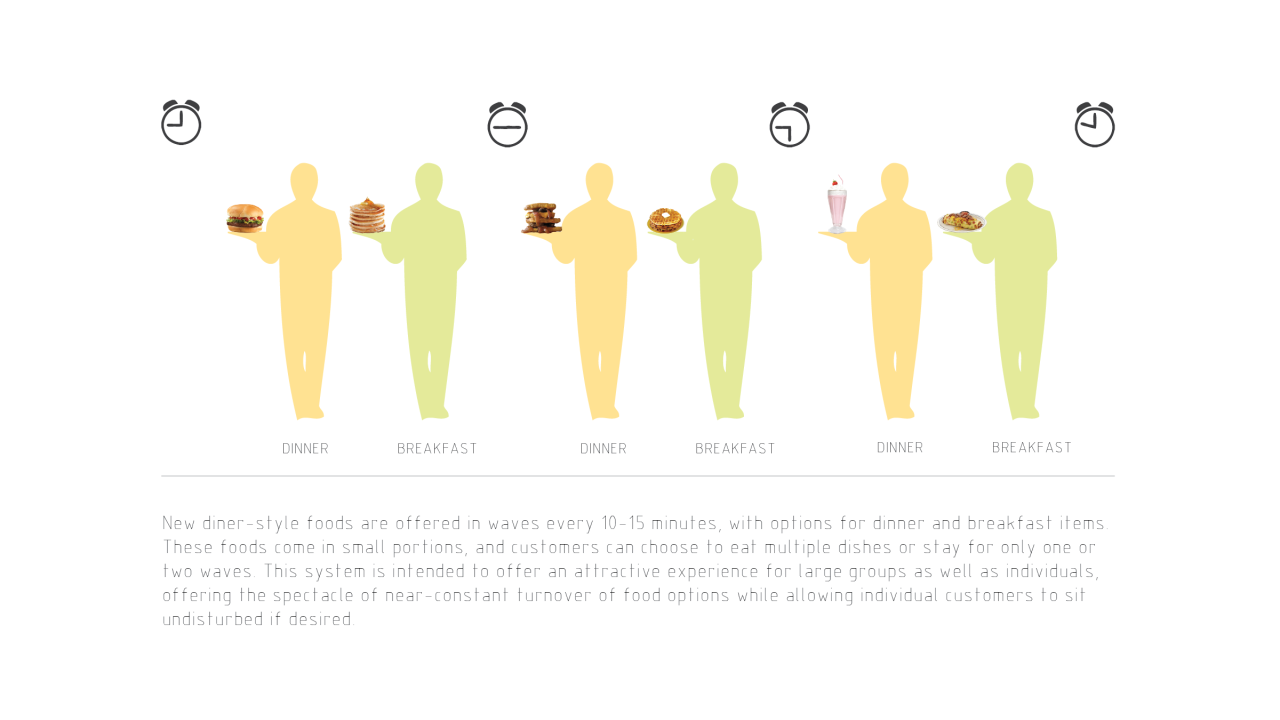 New diner-style foods are offered in waves every 10-15 minutes, with options for dinner and breakfast items. These foods come in small portions, and customers can choose to eat multiple dishes or stay for only one or two waves. This system is intended to offer an attractive experience for large groups as well as individuals, offering the spectacle of near-constant turnover of food options while allowing individual customers to sit undisturbed if desired.
