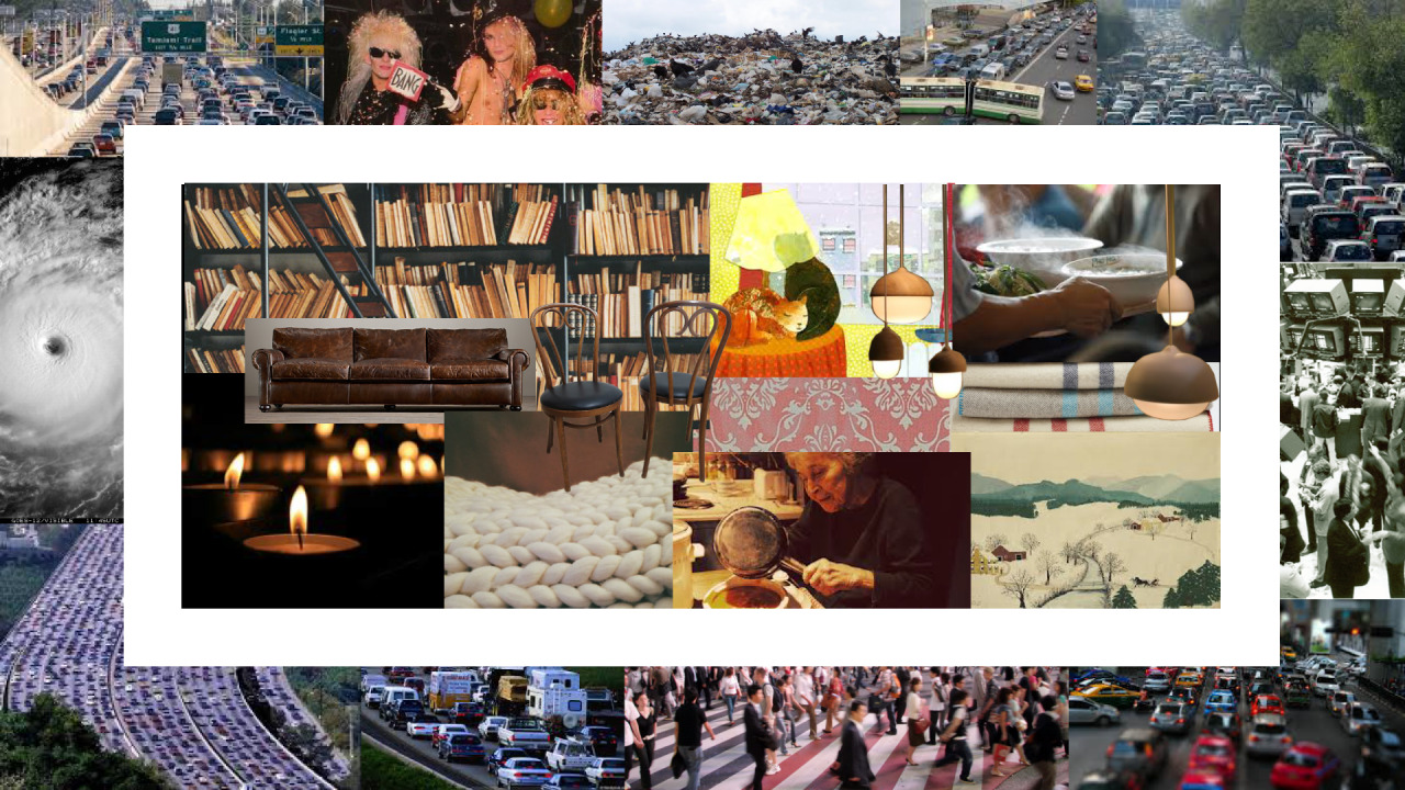 A mood board collage juxtaposing scenes of urban chaos (traffic, hurricanes, crowds) with calm domestic and artisanal environments (bookshelves, candles, furniture, craftwork).