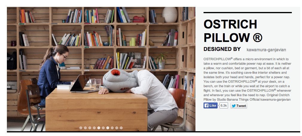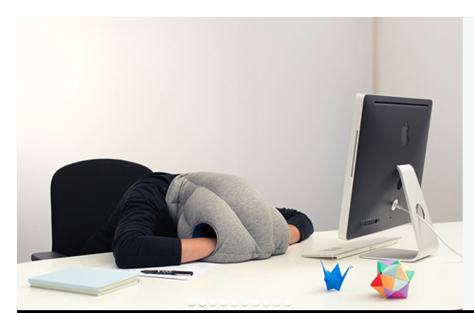 Ostrich Pillow, a wearable head pillow that blocks light and noise to create a private zone for napping, with hand slots and nose/mouth opening.