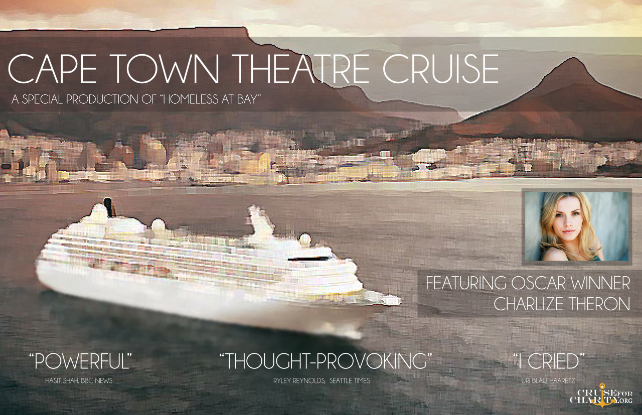 Promotional poster for 'Homeless At Bay,' an immersive theatre concept aboard a Cape Town cruise ship featuring Charlize Theron.