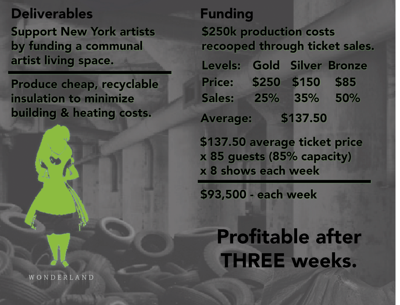 Set in an abandoned grain terminal, the project recoups its investment in three weeks and then raises additional funds for the furthering of the cause. Proceeds benefit a communal living space for New York artists unable to afford market-priced housing.