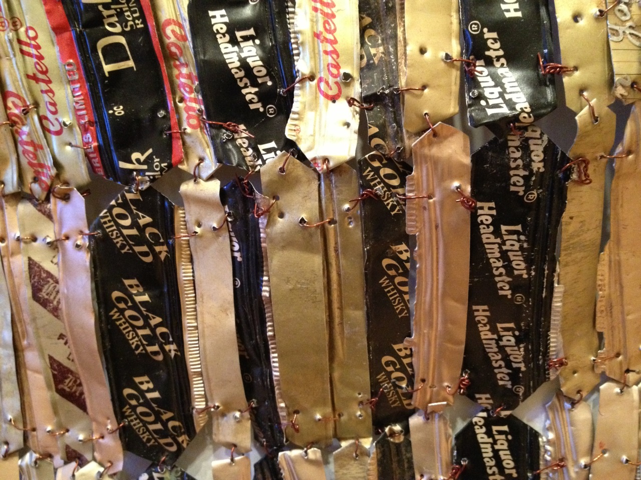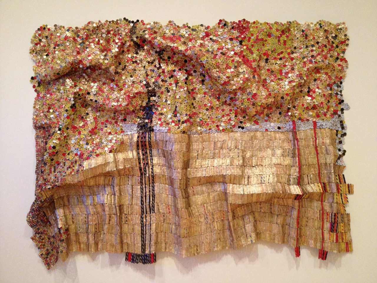 This tapestry is made from discarded liquor-bottle caps and wrappers, by an African artist El Anatsui.