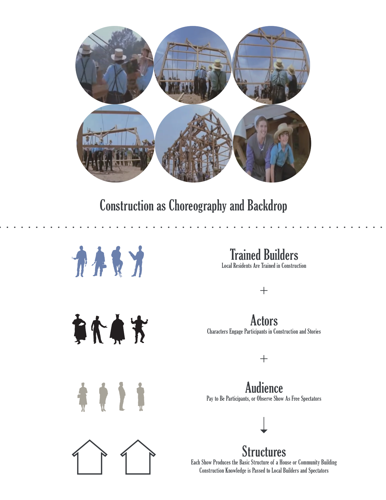 A historical photograph of a community barn raising, showing dozens of people collaboratively constructing a wooden barn frame.