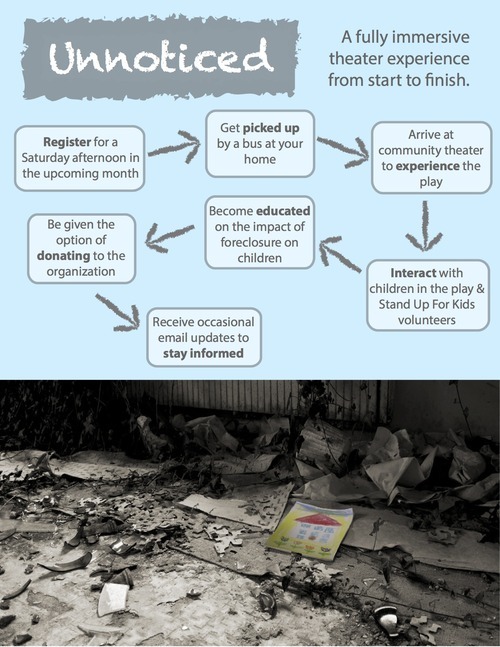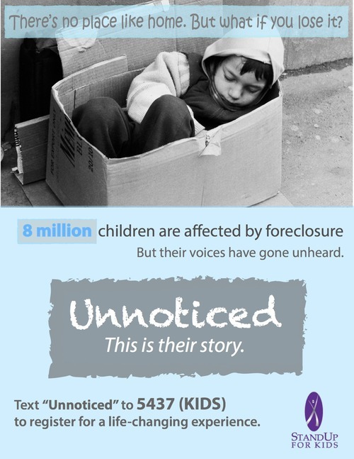 "Unnoticed" campaign poster for StandUp For Kids, raising awareness about 8 million children affected by foreclosure through an immersive experience activated via text message.