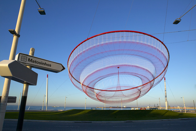 A monumental public net sculpture in Porto, Portugal — a wind-responsive multi-layer net suspended from striped steel poles over Cidade Salvador Plaza.