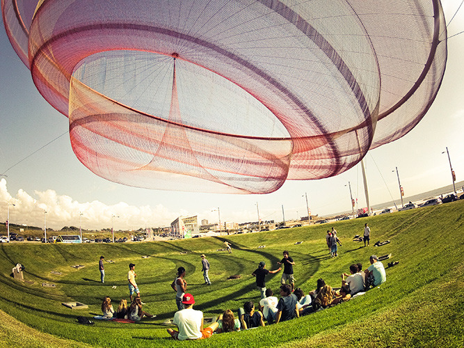 Using color and material to invoke the memory of the site’s history as a fishing and industrial center, this three-dimensional multi-layer net floats over the Cidade Salvador Plaza. It is credited as the first permanent, monumental public sculpture to use an entirely soft and flexible set of membranes moving fluidly in wind. The work casts cinematic shadow drawings onto the ground, further highlighting the “wind choreography.” The city has made the sculpture its graphic symbol and residents give different interpretations of the work, from fishing nets, ships and masts of the Portuguese maritime history, the red-and-white striped smokestacks of the area’s industrial past, to Portuguese lace, sea creatures, and ripples in water.