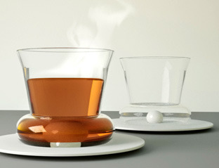 A modern glass teacup-and-saucer set with an integrated design that eliminates the need for a separate spoon, featuring a clean minimalist aesthetic.